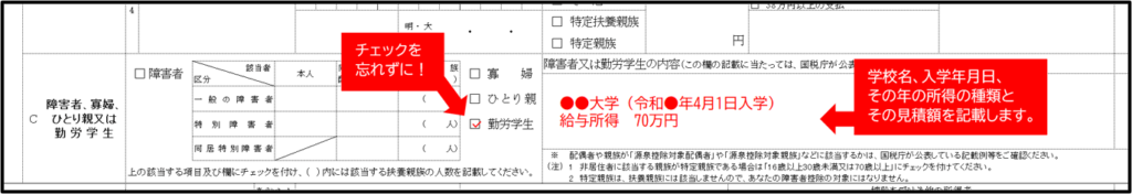 制度を利用する際は、扶養控除等申告書に勤労学生に該当する旨を記入するのを忘れないようにしてください。