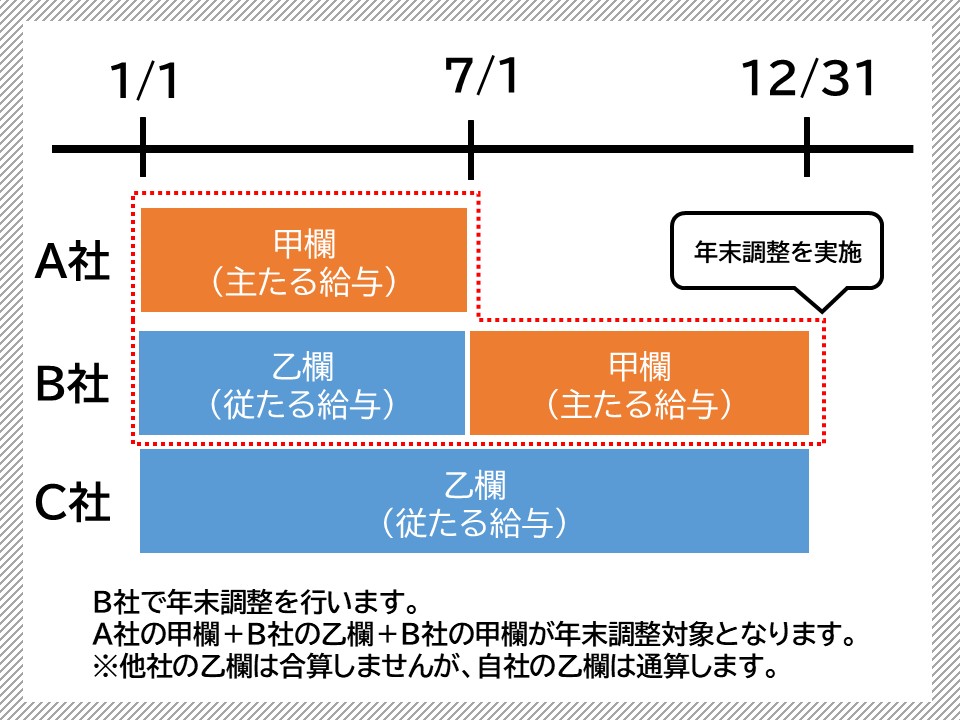 ・ 7月:A社退職 → B社に扶養控除申告書を提出し、主たる給与がB社へ移行